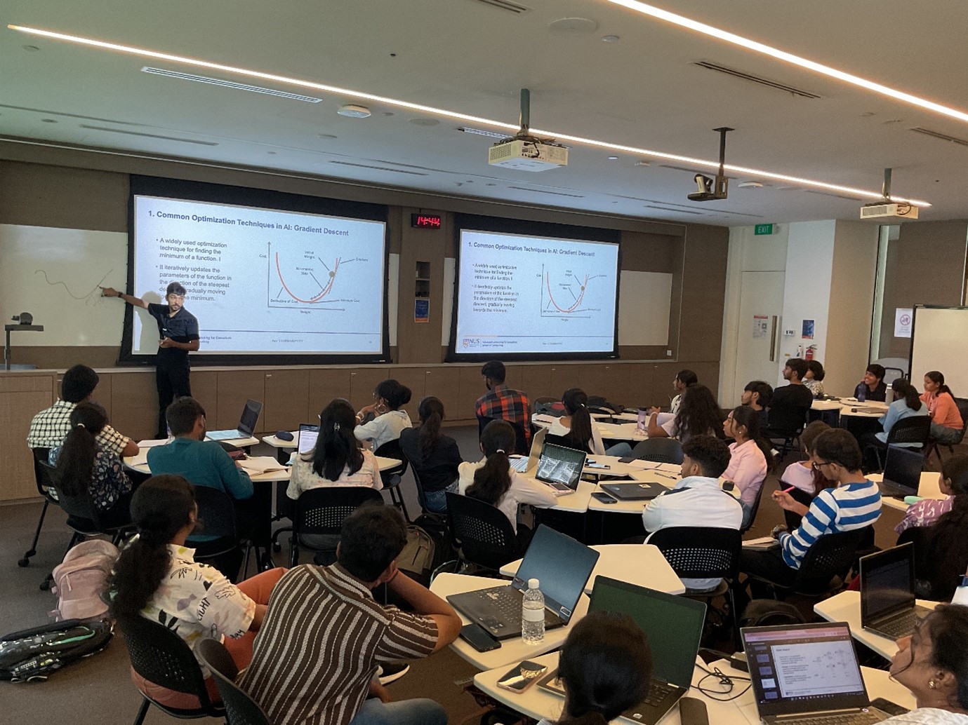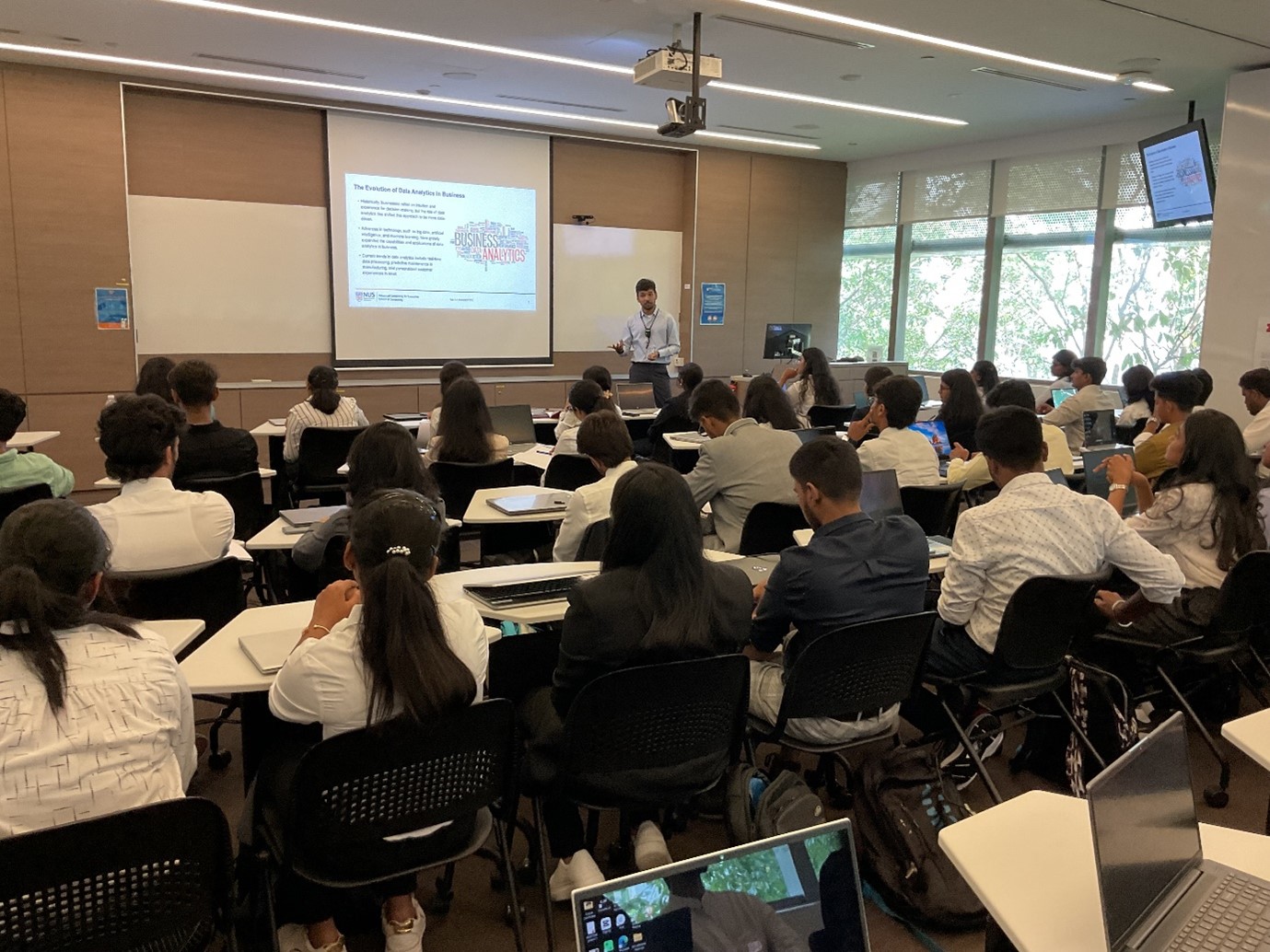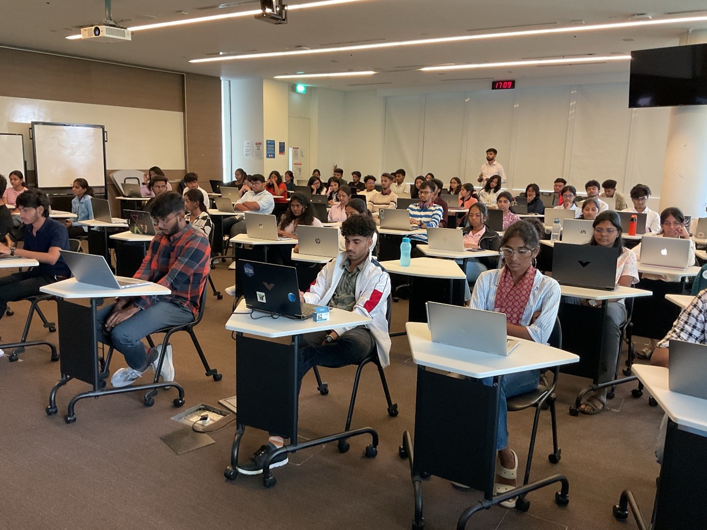 A group of 55 students, including 53 from Data Science and 2 from Commerce, is participating in a one-week Global Immersion program on AI & Deep Learning at the National University of Singapore (NUS). On the first day, they attended a workshop that covered the significance of Data Analytics in business, an introduction to Machine Learning, and its various applications. The session explored different types of Machine Learning, such as Supervised, Unsupervised, and Reinforcement Learning, along with common algorithms like Regression, Classification, and Clustering. The workshop included hands-on mini-projects, where students applied their knowledge using Collab/Python for tasks like Customer Churn Prediction, Housing Price Prediction, and Customer Segmentation.