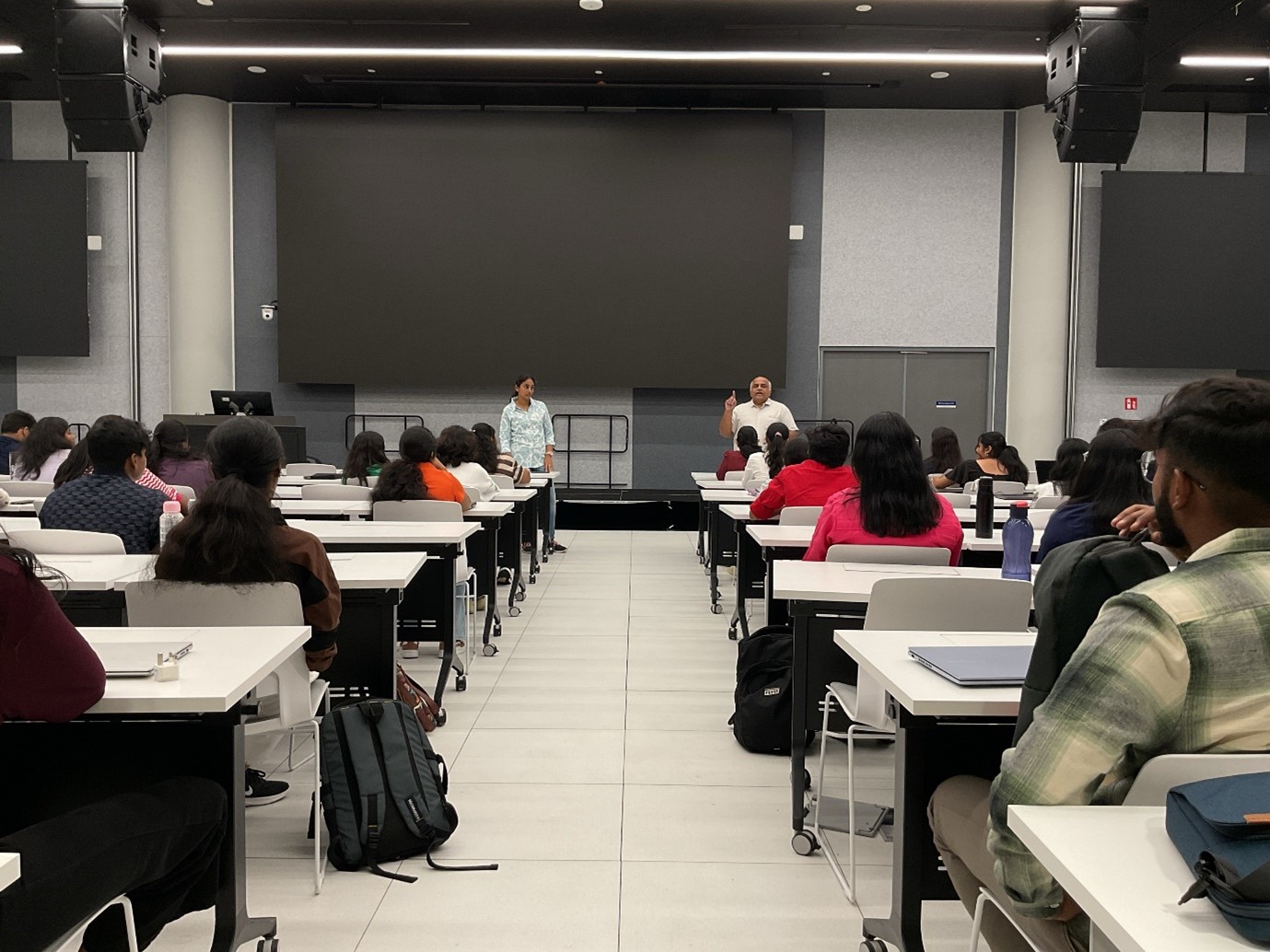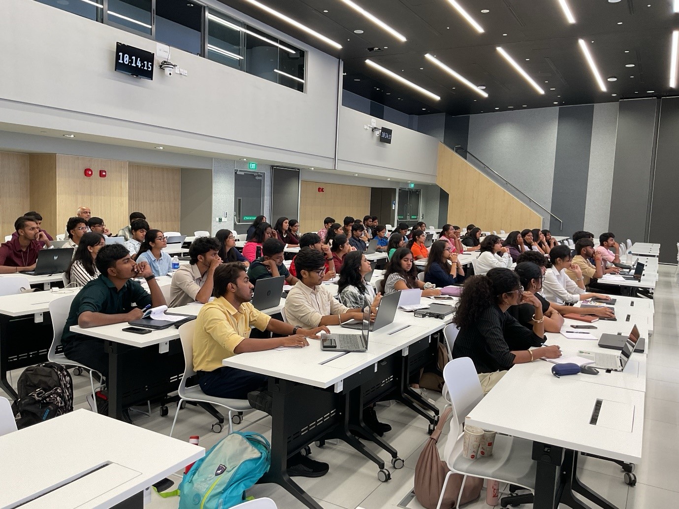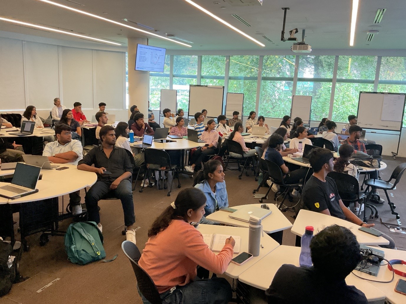 A group of 55 students, including 53 from Data Science and 2 from Commerce, is participating in a one-week Global Immersion program on AI & Deep Learning at the National University of Singapore (NUS). On the first day, they attended a workshop that covered the significance of Data Analytics in business, an introduction to Machine Learning, and its various applications. The session explored different types of Machine Learning, such as Supervised, Unsupervised, and Reinforcement Learning, along with common algorithms like Regression, Classification, and Clustering. The workshop included hands-on mini-projects, where students applied their knowledge using Collab/Python for tasks like Customer Churn Prediction, Housing Price Prediction, and Customer Segmentation.