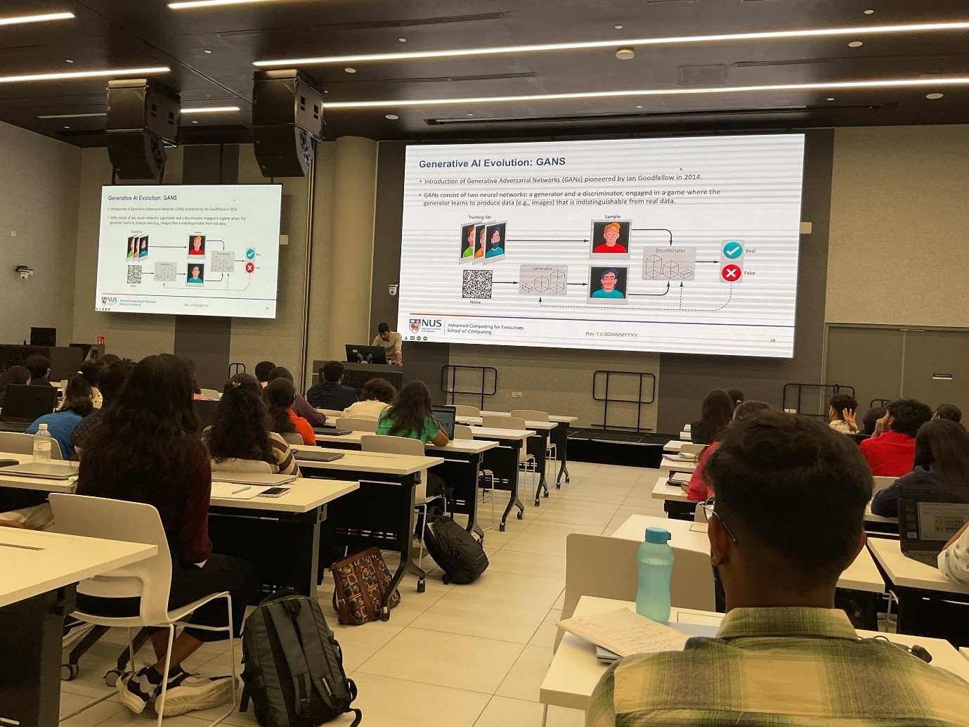 On Day 3, students engaged in a blend of classroom sessions, an online exam, and team-based project discussions with a professor from NUS. In class, they focused on optimizing pre-trained models for specific business applications. They explored techniques for adapting these models to different domains, including adding new layers to capture domain-specific features and fine-tuning existing layers to enhance performance on specialized tasks. The session covered effective fine-tuning methods, such as regularization strategies and adjusting learning rates, along with hyperparameter tuning techniques like beam search and Bayesian optimization. Ethical considerations, such as addressing bias, protecting privacy, and ensuring transparency, were also discussed. During practical exercises, students revisited previous projects to apply these advanced techniques, making them more relevant and impactful for business use cases.