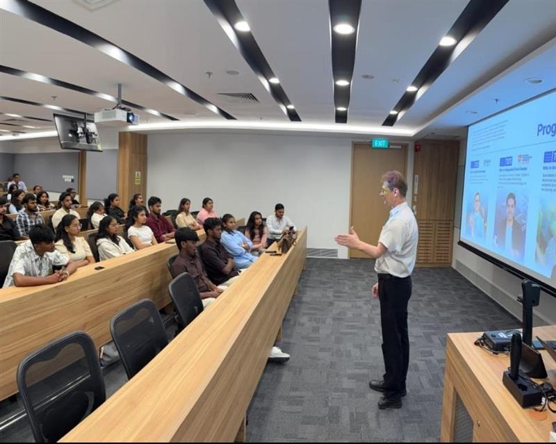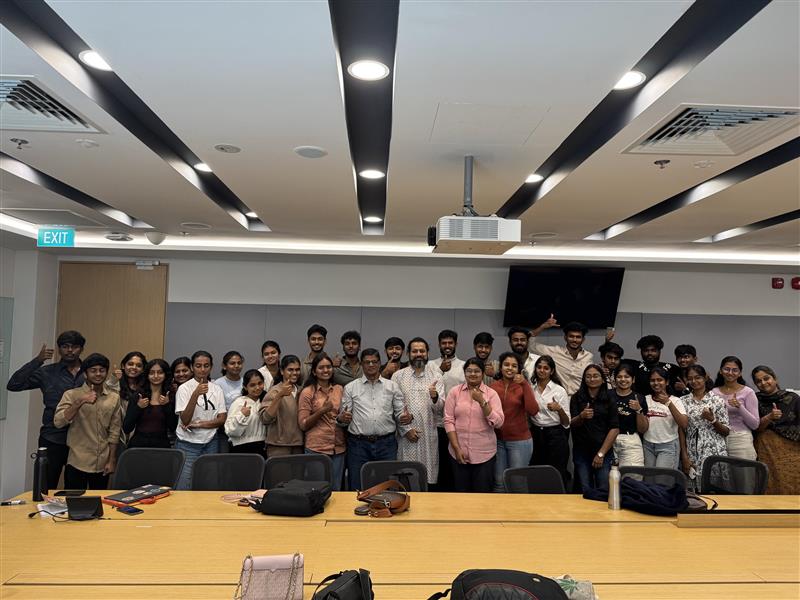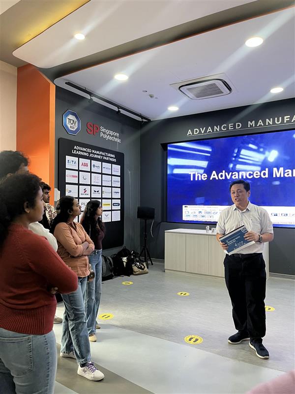 In the afternoon, students visited Singapore Polytechnic as part of the Advanced Manufacturing Learning Journey. The visit provided valuable insights into Singapore’s research-driven innovation ecosystem, showcasing how the institute collaborates with Small and Medium Enterprises (SMEs) to enhance efficiency, reduce costs, and promote technological growth. A key highlight was a hands-on demonstration with a robotic dog, offering students firsthand experience in AI and robotics. The session illustrated how academic research, technology, and industry partnerships shape the future of advanced manufacturing.