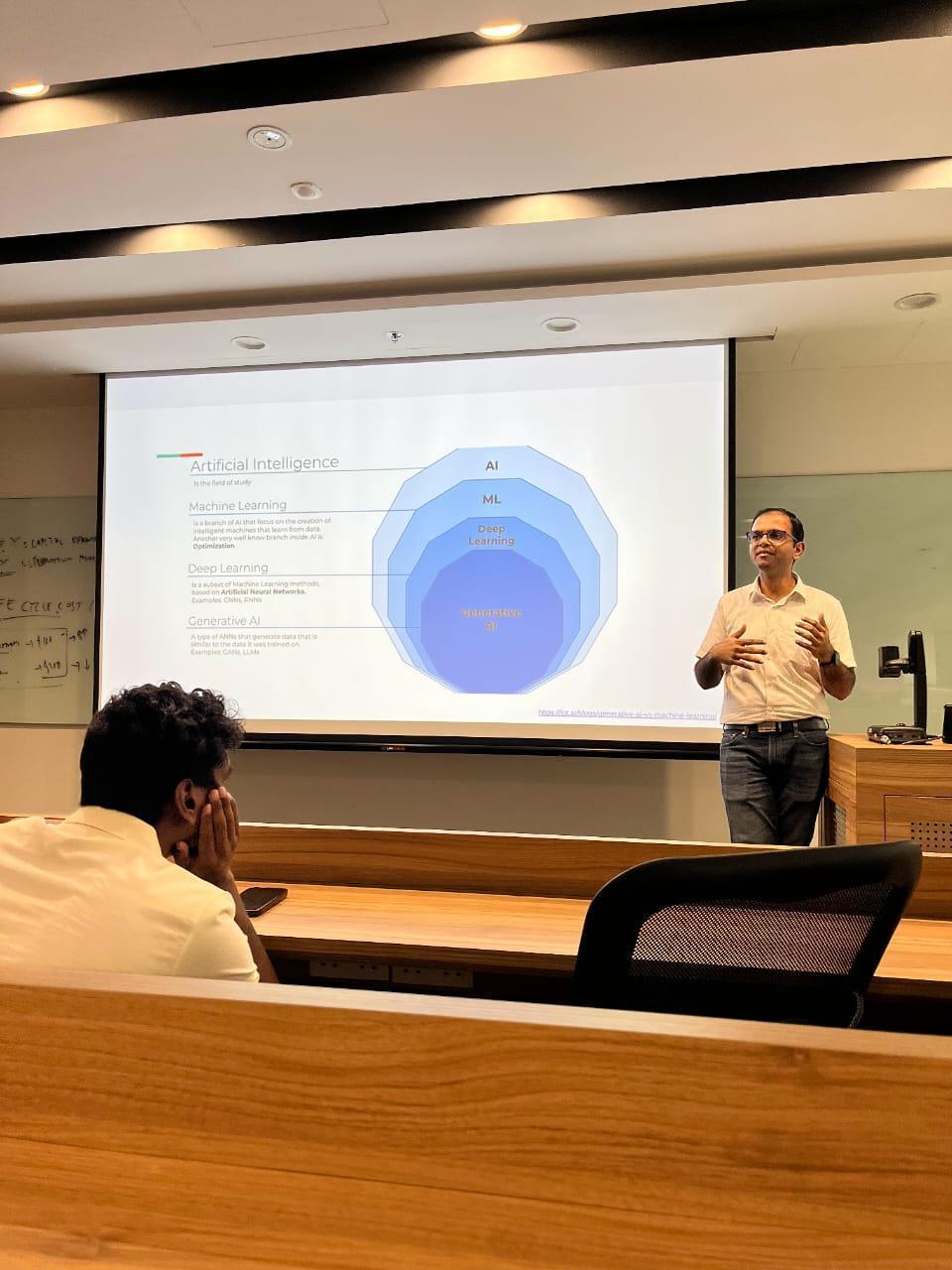 In the following session, Dr. Josey Mathew presented “Demystifying AI”, giving students a clear understanding of Artificial Intelligence—from Machine Learning and Deep Learning to Generative and Agentic AI. He explained how large-scale data and computational advancements drive intelligent behaviour and how AI is transforming industries. The discussion also covered India’s growing AI ecosystem, including its $15 billion investment in AI infrastructure. Dr. Mathew stressed the importance of identifying real-world problems before implementing AI solutions and maintaining a balance between opportunities, risks, and ethics.