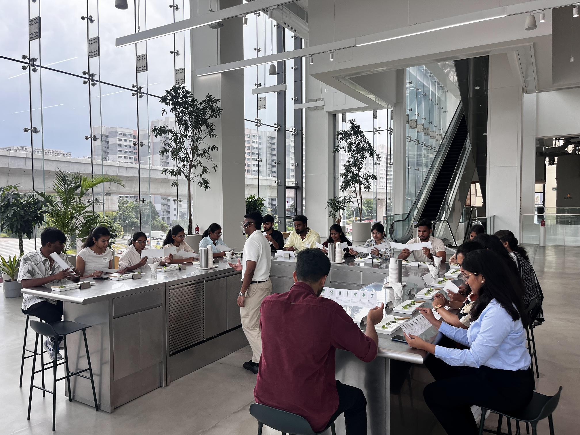 In the afternoon, students visited the Hyundai Motor Group Innovation Centre in Singapore (HMGICS), gaining a first-hand experience of how technology, creativity, and sustainability intersect. The visit included a guided tour of the artificial plantation area, where students harvested and tasted crops, learning about Singapore’s “30 by 30” vision to produce 30% of its food needs locally by 2030.