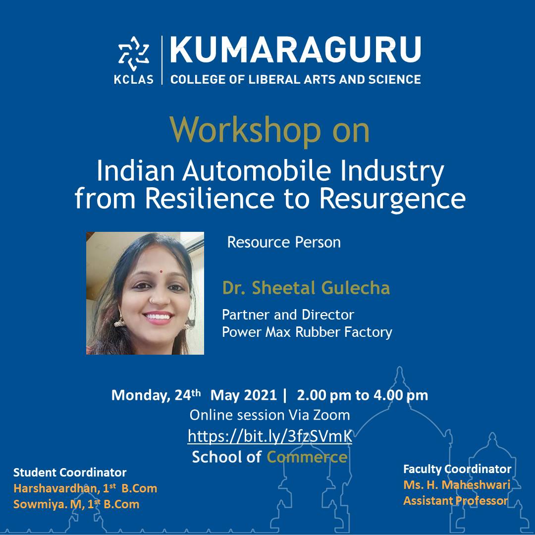 School of Commerce is organizing a Workshop on ” Indian Automobile Industry from Resilience to Resurgence” by Dr. Sheetal Gulecha, Partner and Director, Power Max Rubber Factory, Chennai, on 24th May 2021 from 2PM to 4 PM Via Zoom.